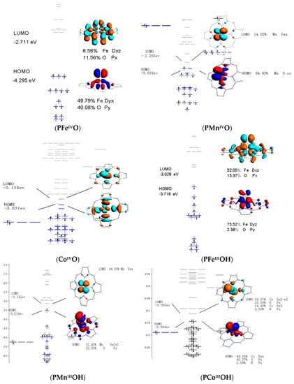 As shown in Figure 8, LUMO of PFeIIIOH was consisted with Fe-dxz and O-px, to form the π * orbital of PFeIIIOH. The HOMO of PFeIIIOH was made up by Fe-dyz and O-py, generating the π orbital of PFeIIIOH. They provided the px,y characters, which is perpendicular to the Fe-O bond. PMnIIIOH was observed to σ bond with Mn-dx2-y2 and O-px orbitals, which provided a character for C-H bond attacking along with the Fe-O bond. Finally, for the PCoIIIOH, LUMO has a character of dz2 σ, which displayed oxo px character that is oriented along with Fe-O bond. The HOMO of PCoIIIOH was dπ FMO that is composed of Co-pxz and O-pz, facilitating C-H bond attacked perpendicular to Co-O bond. The FMO of PCoIIIOH provided flexible orientation for C-H bond attack and it implied a potential oxidant for PCoIIIOH.