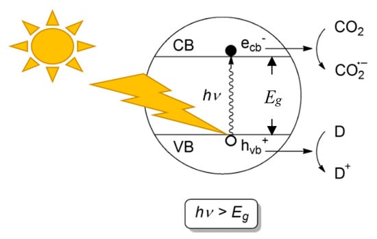 In the photocatalytic approach, semiconductors irradiated by UV or visible light are used for the reduction of CO2. As can be seen in Figure 1, the light energy (hv) absorbed by the photocatalyst is used to produce electron–hole pairs, which are generated when that energy is equal or greater than the band gap energy (Eg) of the photocatalyst. Only then will the electrons (e−) be promoted from the valence band (VB) to the conduction band (CB) of the semiconducting material, simultaneously creating a hole (h+) at the VB [20]. The e− and h+ are then transferred to active redox species present across the photocatalytic interface in order to participate in the conversion process [26].