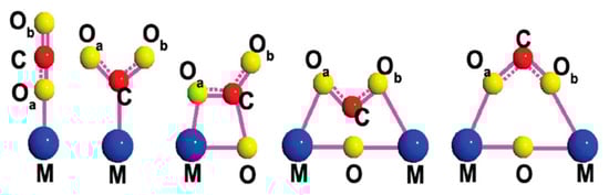 If the participating species are adsorbed on the semiconductor surface, then the photocatalytic process will certainly be more efficient due to the decrease in activation energy and increase in substrate concentration near reactive sites. When CO2 adsorbs onto the photocatalyst surface, its structure transforms from linear to the more reactive bent form (Figure 2). More specifically, the carbon atom of CO2 binds to a surface oxygen site, while the oxygen atom binds to the surface metal center of the metal oxide [42]. As a result of the structural transformation, the lowest unoccupied molecular orbital (LUMO) level of the metal oxide decreases lowering its activation energy [39]. However, density functional theory (DFT) calculations performed by Sorescu et al. [43] demonstrated that CO2 preferentially binds to the metal oxide surface in a linear geometry. This is most probably due to the low binding energy (−46 kJ/mol) associated with the linear configuration, the considerable energy required to bend CO2 (38.6 kcal/mol) and the significant deformation the metal oxide surface undergoes when binding to bent CO2 [42,43].