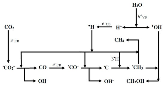 Gaseous phase photocatalysis of CO2 and water: proposed reaction pathway. Reproduced from work in [39]. Copyright 2016 Elsevier Ltd.