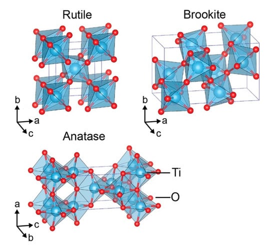 As shown in Figure 7, TiO2 exists as one of three mineral phases: anatase, brookite, and rutile. Anatase-phase TiO2 is the most common phase of TiO2, but has a band gap of 3.2 eV, and is therefore weakly active under visible light. Rutile-phase, with a band gap of 3.0 eV, has the strongest visible light absorption, whereas brookite (band gap = 3.3 eV) has the weakest [65]. The use of mixed-phase TiO2 enhances both the visible light harvesting ability and the electron–hole separation of TiO2 [66]. The crystalline phase of TiO2 is highly dependent on its preparation technique.
