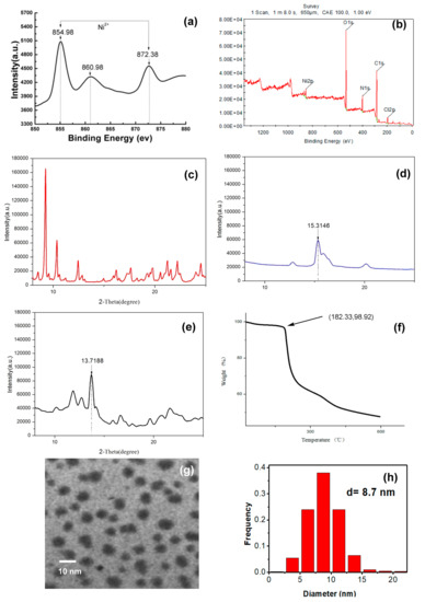 (a,b) XPS analysis of glycosylpyridyl-triazole@nickel nanoparticles (GPT-Ni); (c) XRD of GPT; (d) XRD of NiCl2; (e) XRD of GPT-Ni; (f) thermogravimetric analysis (TG) plots of GPT-Ni; (g,h) TEM image of GPT-Ni.