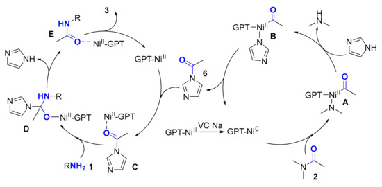 Based on the results above, a plausible mechanism was proposed as shown in Figure 3. The GPT-Ni catalyst plays a dual role in this reaction. Firstly, GPT-NiII was reduced to GPT-Ni0 in the presence of VC Na which used as a reductant. The generated GPT-Ni0 inserted into the C–N bond of DMA to form complex A though oxidative addition. Then, complex A was converted to complex B via ligand exchange. Subsequent reductive elimination provided the important intermediate acetylimidazole (6). Nextly, GPT-NiII used as Lewis acid to coordinate with acetylimidazole (4) to form complex C. Then, nucleophilic attack of amine (1) on complex C provides complex D followed by the release of imidazole that leads to the generation of complex E. Finally, target product 3 is obtained via a metal dissociation process.