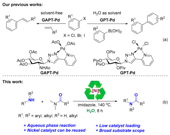 In recent years, the utilization of biomass sources such as carbohydrate, starch, cellulose and lignin also has produced great interest in the preparation of nanoparticles due to its green and essential roles in catalyzed reactions [29,30,31,32,33]. Recently, our group has prepared a highly active and easily recoverable heterogeneously sugar-based palladium catalysts which have been used for solvent-free Mizoroki-Heck reactions [34] and aqueous phase Suzuki-Miyaura couplings (Scheme 1a) [35]. Continuing our interests in the development of biomass-based catalyst [36], we sought to a catalytic system that would be convenient to prepare, and afford lower catalyst loading without the need of any organic ligand. Herein, we reported an efficient method for the synthesis of glycosylpyridyl-triazole@nickel nano catalysts (GPT-Ni) which were fully characterized by high resolution mass spectrum (HRMS), X-ray diffraction (XRD), infrared spectroscopy (IR), thermogravimetric analysis (TG), and transmission electron microscopy (TEM). The as-prepared catalysts were applied to catalytic acylation of amines (Scheme 1b), providing the corresponding amides in good yields.