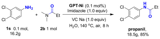 Encouraged by these promising results, the N-formylation of amines using DMF as the carbonyl source under the optimal reaction conditions was investigated (Table 3). Interestingly, the o, m-, and p-substituted amines gave the corresponding products in good yields. To demonstrate the synthetic application of the strategy, we applied the developed GPT-Ni catalyzed N-propionylation strategy to the synthesis of propanil which is a widely used contact herbicide. The reaction could afford propanil in up to 85% yield in gram scale (Scheme 3).