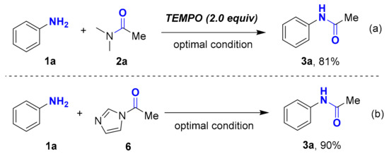 To get insights into the mechanism of GPT-Ni catalyzed acylation of amines, control experiments with selected substrates have been performed. Firstly, the acylation process could still proceed well in the presence of 2,2,6,6-tetramethyl piperidine-1-oxyl (TEMPO) (Scheme 4a). This result clearly shows that a free radical process was not involved in the reaction. Then, the reaction was performed by using acetylimidazole (6) as acylation agent directly, an excellent yield of product up to 90% was obtained (Scheme 4b). This result explains that the compound 6 is an important intermediate in this transformation.