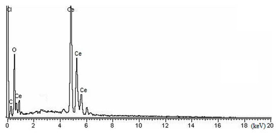 From the SEM micrographs (Figure 1a,b), it can be seen that the morphology of prepared CeO2 is rod-like. These nanorods are uniform in shape and size, and they are not agglomerated. At different magnification levels, the SEM images revealed that the nanorods have mean diameter of 50–60 nm, whereas their mean length was 150–200 nm.