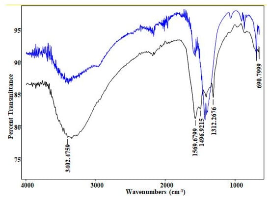 Both the polydopamine-coated and uncoated CeO2 nanorods were scanned for FTIR spectroscopy in the range of 600–4000 cm−1 (Figure 4). FTIR spectrum (blue colored) reveals the functional groups and the chemical bonds that are present in the synthesized, uncoated CeO2 nanorods, whereas FTIR (black colored) spectrum confirms the functionalization of CeO2 nanorods with polydopamine layer. The broad band at 3402.47 cm−1 corresponds to (the stretching vibration of O-H bond) OH-groups. The peak around 1569.67 cm−1 is ascribed to the bending vibration of N-H group. The absorption peak around 1496.92 cm−1 indicates the -CH2 vibrations. The intense band at 691.17 cm−1 corresponds to the Ce-O stretching vibrations []; another additional peak at 1312.27 cm−1 corresponds to the C-O bonds in dopamine molecule that verifies the dopamine addition on CeO2 nanorods [].