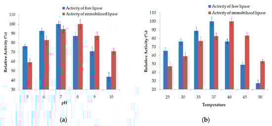 (a) The impact of pH on the activity of free lipase and synthesized nano-biocatalyst at 37 °C and (b) the impact of temperature on the activity of free lipase and synthesized nano-biocatalyst at pH 7.