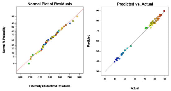 Fitness of the model was also affirmed by the normality and predicted vs. actual values graph (Figure 6). The linear distribution of data along the straight line in normality plot of the model depicts the fitness of quadratic models, while the small difference b/w predicted, and actual values of biodiesel yield further advocates the significance of quadratic models.