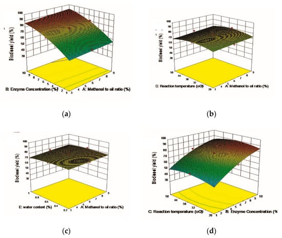 Mumtaz et al. also reported the ANOVA for bio-catalytic synthesis of palm oil-based biodiesel. According to their findings, liner terms that showed a significant effect on response (% biodiesel) were A (amount of bio-catalyst), B (reaction time), and D (methanol/oil ratio). Among first-order interacting terms, AD showed significant influence on biodiesel yield. Among quadratic terms, B2 and D2 were depicted to be significant []. In another previous study, Chang et al. reported the analysis of variance for experimental data obtained by Lipase catalyzed biodiesel production from Novozym 435. The significant linear terms were X2 (reaction temperature), X3 (enzyme concentration), X4 (substrate molar ratio), and X5 (water content), while the non-significant term was X1 (reaction time) [].