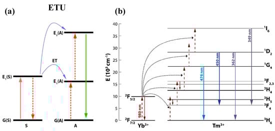 (a) The energy transfer upconversion (ETU) mechanism. ET – energy transfer, S – sensitizer, A – activator. (b) Schematic energy level diagram for the Yb3+–Tm3+ pair with transitions responsible for the UV and visible light emissions upon 980 nm excitation.