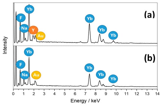 The energy-dispersive X-ray spectroscopy (EDX) measurements (Figure 3) reveal that the samples consist of Na, F, Yb, and Y elements. For the core-shell sample, yttrium is found in both large and small crystals. The presence of the Au peaks is due to the preparation method of the samples for the SEM analysis. The lack of the Tm peak, however, is attributed to the concentration of this element being below the detection limit.