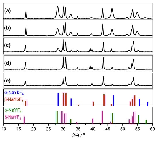 XRD patterns of (a) NaYb0.99F4:Tm0.01@NaYF4, (b) NaYb0.99F4:Tm0.01, (c) NaY0.3F4:Yb0.69Tm0.01, (d) NaY0.5F4:Yb0.49Tm0.01, and (e) NaY0.7F4:Yb0.29Tm0.01, with reference to hexagonal (β) and cubic (α) phases of NaYbF4 and NaYF4, according to #27-1427, #77-2043, #16-0334 and 77-2042 files from the JCPDS database, respectively.