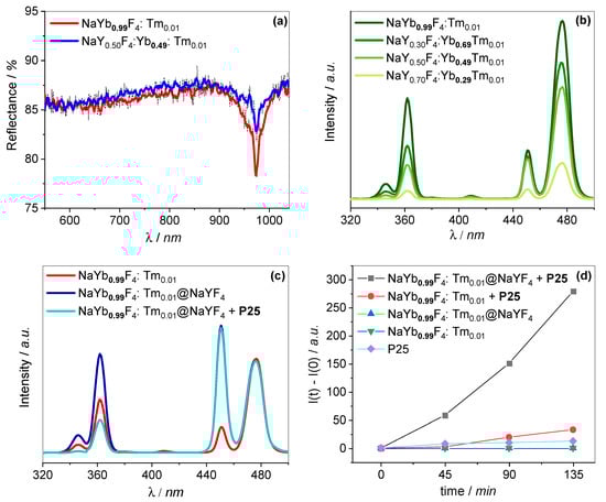 The UC emission band’s intensities and their ratios depend strongly not only on the concentration of the sensitizer or activator ions, but also on the efficiency of quenching on high-energy oscillators, such as surface defects, capping ligands, and solvent molecules. These processes become more significant for the particles with a high surface-to-volume ratio. An effective strategy for improving the luminescent properties of UCPs is to grow a protective shell around the core-particle to reduce a non-radiative energy dissipation. In the case of core–shell structures of UCPs, the emission centers are spatially isolated from the surface quenchers. The use of homogeneous inert coating without any sensitizer or activator ions also prevents undesirable energy-migration processes between active ions in the core and the shell. As shown in the work of Mai et al., an optically inactive NaYF4 shell deposited on a luminescent NaYF4:Yb,Er core enhanced the upconversion luminescence intensity []. We have investigated the influence of the NaYF4 coating on the emission intensity of the NaYb0.99F4:Tm0.01 upconverting particles and the resulting photocatalytic activity of the TiO2 (P25) mixed with the core and core–shell materials upon NIR irradiation.