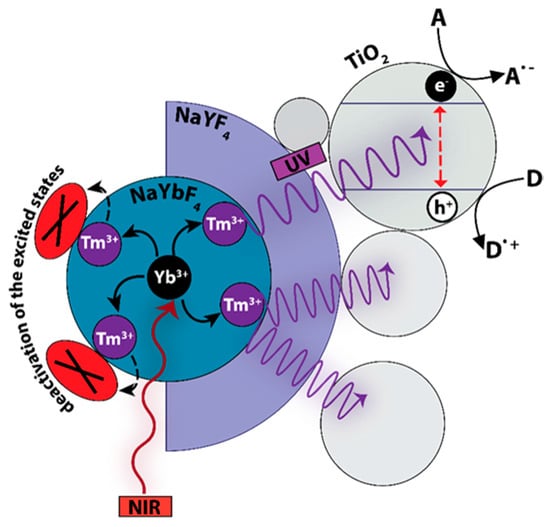 Photocatalysis is a feasible solution for the emerging environmental and economic issues of humankind. It can be used for water treatment, air purification, and hydrogen production powered only by the sunlight [,,]. Most of the solar radiation that reaches the Earth’s surface lies within the visible and infrared region. However, conventional photocatalysts, such as TiO2 or ZnO, while cheap, non-toxic, and chemically stable, absorb only ultraviolet (UV) light, which constitutes less than 5% of the energy received from the Sun []. In order to extend their photocatalytic activity for visible light, several modifications have been utilized, such as noble metal deposition, transition metal doping, or photosensitization [,,,,]. In the case of the infrared light utilization, one of the most effective approaches is to use lanthanide-doped materials that are able to harvest near-infrared (NIR) photons and convert them into UV and visible light []. Therefore, the upconverted light can be utilized to excite TiO2 and trigger the photocatalytic reaction. However, the photocatalytic systems based on the upconverting particles (UCPs) suffer from a low efficiency []. This is because the upconversion (UC) is a multiphoton nonlinear process that requires high power density of the incident light and is sensitive to any luminescence quenching and cross de-excitation [,]. Thus, much effort is put into research to increase the efficiency of the UC processes occurring in materials suitable for photocatalytic applications.