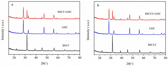XRD analysis of BSCF-GDC and BSCFZ-GDC mixtures (50:50 in mass ratio) calcined at 1050 °C for 6 h under air atmosphere was also conducted to evaluate the chemical compatibility of cathode materials and GDC buffer layer. As can be observed in Figure 2, the XRD results indicate respective phases of the GDC, BSCFZ, and BSCF without the formation of impurities, suggesting good chemical compatibility with each other even at a temperature much higher than the operating temperature (≤750 °C).
