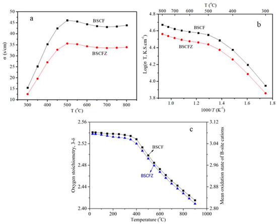 Influences of temperature on electrical conductivity (a): linear plot; (b): Arrhenius plot and (c): oxygen stoichiometry of BSCF and BSCFZ materials in air.