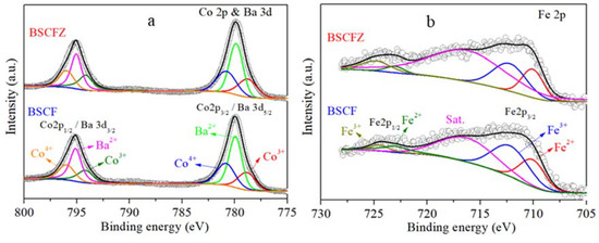 As shown in Figure 3a,b, the Zn doping in B-site led to decreased total conductivity with maximum value being 46.4 and 35.6 S/cm for BSCF and BSCFZ, respectively. This can be ascribed to enhanced oxygen vacancy concentration and thus decreased B-site cations average valence as shown in Figure 3c, since partial Fe and Co commonly have higher valence states of 3+ or 4+. To further explore the influence of Zn-doping on B-site cations oxidation state, X-ray photoelectron spectrometer (XPS) analysis was also performed for BSCF and BSCFZ. Figure 4a,b show the core-level XPS spectra of Co 2p and Fe 2p. As shown in Figure 4a, four components can be obtained by deconvoluting the Co2p spectra of both samples, which were attributed to Co 2p1/2 and Co 2p3/2, respectively. The peaks at 778.96 and 794.19 eV can be assigned to Co3+, while the peaks at 780.88 and 796.01 eV could be assigned to Co4+, assuming that Co3+ and Co4+ were the main valence states of Co [34,35]. The Co 2p3/2–Co 2p1/2 energy splitting (~15.2 eV) was consistent with those reported. However, it must be noted that this does not exclude the existence of Co2+, since the peaks for Co2+ are generally considered to overlap with the peaks for Co3+, Co4+ and Ba2+ [38]. Therefore, it is very challenging to quantitatively determine the surface Co valence by fitting the Co 2p peaks. Despite this, it can be inferred that Co3+ would be the main valence states, since the average valence of B-site deduced from oxygen stoichiometry (3-δ) was close to 3 at room temperature as shown in Figure 3c. It can be found from Figure 4b, the peak intensities of Fe 2p in both samples are weak due to low Fe content. Deconvolution of the Fe 2p peaks indicates that both Fe3+ and Fe2+ exist, and the satellite peak at ~717.5 suggests that Fe3+ is the main form [34].