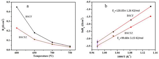 (a) Polarization resistances (Rp) and (b) corresponding Arrhenius plot of BSCF and BSCFZ cathodes of symmetrical cells measured at 600~750 °C.