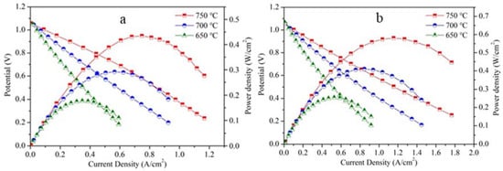 I-V and I-P curves of the fuel cells with (a) BSCF and (b) BSCFZ cathodes measured at 650–750 °C.