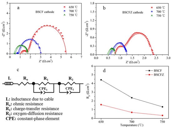 Impedance spectra of single cells with (a) BSCF and (b) BSCFZ cathodes at 650, 700 and 750 °C, (c) equivalent circuit applied to fit the impedance data and (d) summarized Rp from (a,b) as a function of temperature.