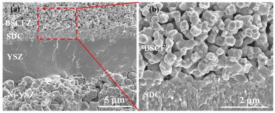 Figure 9 shows the cross-sectional field emission scanning electron microscopy (FE-SEM) images of the single cell with BSCFZ cathode after short-term test. As can be observed in Figure 9a, the YSZ electrolyte layer (about 8 μm in thickness) is dense enough, and exhibits excellent interfacial bonding with both the Ni-YSZ anode and the GDC barrier layer. It can also be found from Figure 9b that the GDC buffer layer (about 2 μm in thickness) and porous BSCFZ cathode are well bonded to each other after test, and no sign of delamination was observed. The GDC functional layer is used to improve the interface of cathode and electrolyte. The porous structure of cathode would facilitate the transportation of oxygen and increment the active sites for ORR to improve the cell performance.