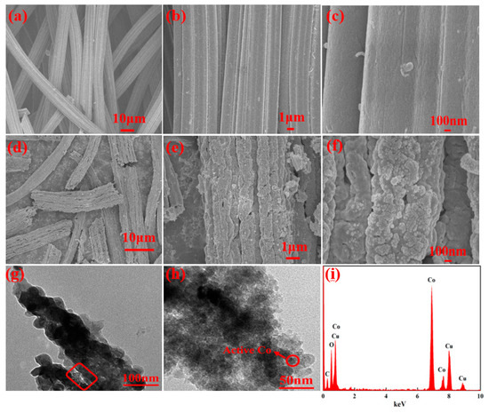 SEM images of (a, b, c) ACFs after acid treatment; (d, e, f) 40% Co-ACFs and (g, h) TEM image and (i) EDS pattern of 40% Co-ACFs.