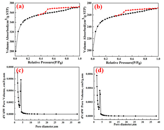 N2 adsorption−desorption isotherms (a) ACFs and (b) 40% Co-ACFs, red line: adsorption curve, black line: desorption curve; pore size distributions (c) ACFs and (d) 40% Co-ACFs.