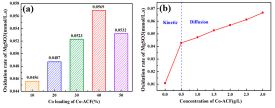 The catalytic performance of Co-ACFs with dissimilar Co loading levels (10, 20, 30, 40, and 50 wt. %) in the oxidation of MgSO3 are investigated. In Figure 4a, a gradual increase of the oxidation rate is observed with increasing Co loading levels from 10% to 40%. It is due to the substantial catalysis activity of Co distributing equally on the surface of ACFs. However, the tendency declines slightly after Co loading reaches 50 wt. %, which might be due to the fact that the excessive Co species has agglomerated on the surface of support [13,14,16,45,46]. Moreover, the catalysis performance of cobalt-based catalysts for sulfite oxidation, including Co-MS, Co-CNTs, Co-SBA-15, and Co-TiO2, are thoroughly compared in Figure S3, in which the active cobalt species are loaded onto the different supports. It shows that 40% Co-ACFs dominates the catalytic performance at the same concentration of 0.5 g/L, which can serve as a promising candidate for the real applications.