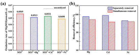 Simultaneous removal of Hg2+, Cd2+, Ni2+, and SO32− (Co wt % = 40%). (a) Effect of heavy metal ions on the oxidation rate of MgSO3. (b) Effect of SO32− on the removal efficiency of heavy metal ions.