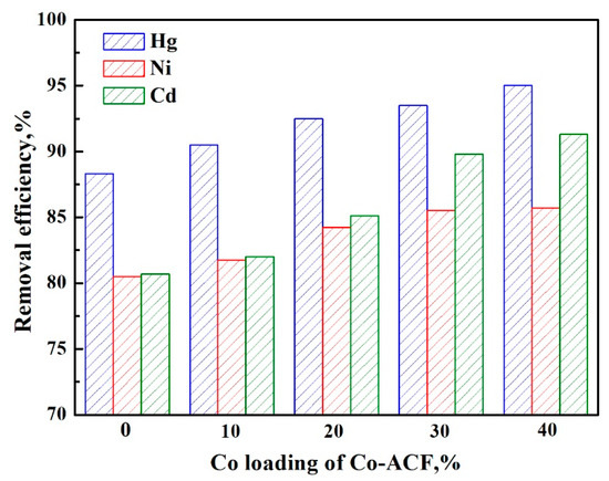 The removal efficiency of ACFs after cobalt loading is higher than pure ACF for Hg2+, Cd2+, and Ni2+, as presented in Figure 6. It might be owed to the deposit of cobalt oxide on the surface of ACFs, which has been heated for 4h at 350 °C. As a result, the appearance becomes rather rough, favoring to adsorbing the heavy metals efficiently. This finding is in good agreement with the SEM results in Figure 1. The removal efficiency gradually increases with the increase of cobalt loading in the ACFs from 0 to 40 wt. %. When the loading of cobalt reaches 40%, the removal efficiency of Hg2+, Cd2+, and Ni2+ reach 95%, 90%, and 85%, respectively, thus revealing high adsorption performance. The BET surface area of the Co-ACFs significantly decreases with increase in cobalt loading, thus indicating that the adsorption of heavy metals is not mainly dependent on the BET surface area of the ACFs. In addition, according to the Boehm titration in Table 2, oxygen-containing functional groups are slightly increased after inducing of cobalt into ACFs, which might benefit for removal of the heavy metals.