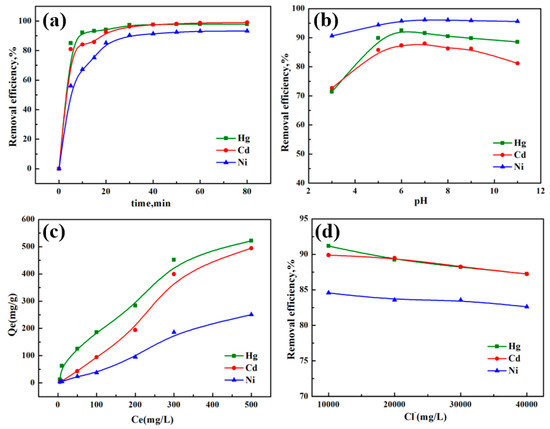 Typical desulfurization wastewater contains staggering levels of chloride. Moreover, the concentration of Cl− is generally in the range of 8000–20,000 mg/L, which may have some influence on the adsorption of heavy metal ions. Thus, the adsorption efficiency of Co-ACFs for Hg2+, Cd2+, and Ni2+ is measured under different Cl− concentrations. The results presented in Figure 7d reveals that the removal efficiency of heavy metal ions decreases slightly with increase in the Cl− concentration. Among these heavy metal ion adsorption phenomena, the adsorption of Hg2+ in the solution has the largest effect. This effect may have been caused by the formation of Hg-Cl complexes in the presence of compounds of Cl−; these products include HgCl2, HgCl3−, and HgCl42−. Thus, the adsorption of Hg2+ is inhibited by Co-ACFs. Cd2+ exists in the form of cadmium chloride colloid when a large amount of Cl− is in the desulfurizing slurry; this also affects the removal efficiency of Cd2+ by Co-ACFs. The concentration of Cl− has almost no effect on the removal efficiency of Ni2+.