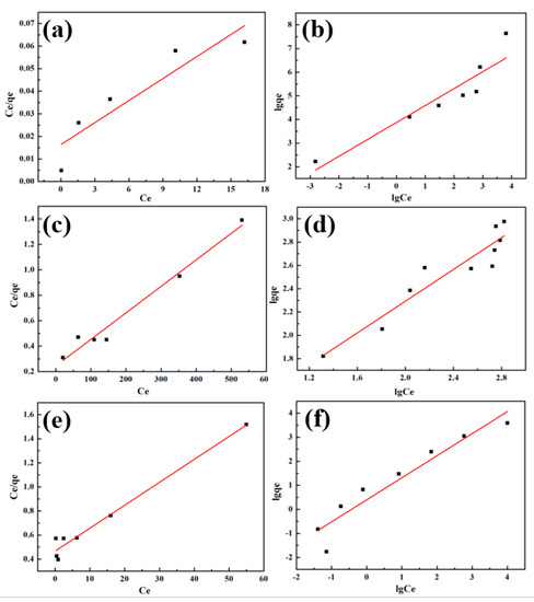 The Langmuir [52] and Freundlich [53] models, which are classical isothermal adsorption models, were used to determine the maximum adsorption capacity of Co-ACF for heavy metal ions. The maximum adsorption capacity obtained using Langmuir and Freundlich models can be expressed by Equations (4) and (5), respectively: