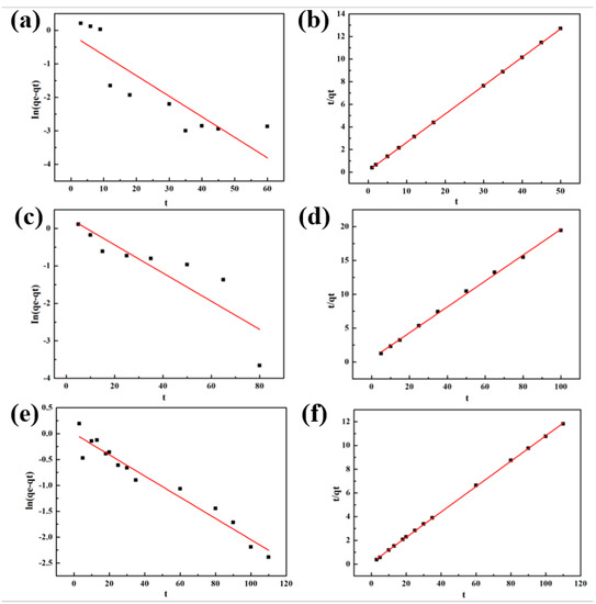Adsorption kinetics model (Co wt % = 40%). (a, c, e) pseudo-first-order model (Hg2+, Cd2+, Ni2+); (b, d, f) pseudo-second-order model (Hg2+, Cd2+, Ni2+).