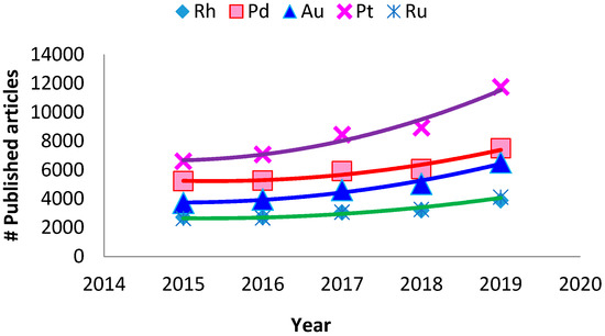 Precious metal catalysis is often synonymous with diversity and versatility. These metals successfully catalyze oxidation and hydrogenation due to their dissociative behavior towards hydrogen and oxygen, dehydrogenation, isomerization and aromatization, propylene production, etc. The precious metal catalysts, especially platinum-based catalysts, are involved in a variety of industrial processes. Examples include the Pt-Rh gauze for nitric acid production, the Ir and Ru carbonyl complex for acetic acid production, the Pt/Al2O3 catalyst for the cyclohexane and propylene production, and Pd/Al2O3 catalysts for petrochemical hydropurification reactions etc. A quick search over the number of published articles in the last five years containing a combination of corresponding “metals” (Pt, Pd, Ru, Rh and Au) and “catalysts” as keywords indicates the importance of the Pt catalysts, but also the continuous increase in Pd and Au contribution (Figure 1).