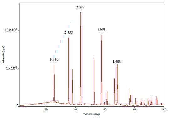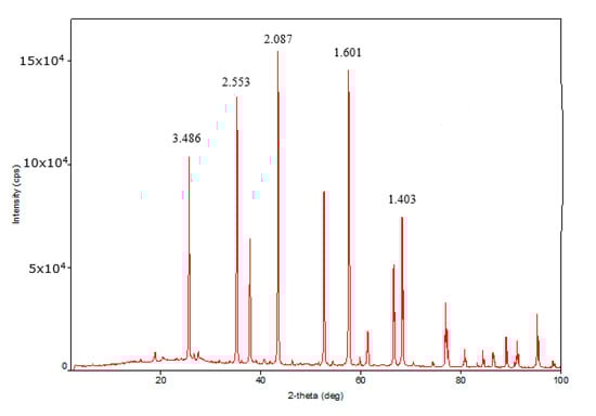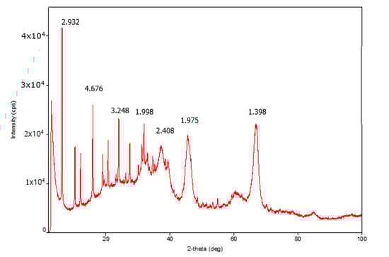 X-ray diffraction (XRD) analysis of the traditional granular catalyst showed the presence of γ-Al2O3 and zeolite Y in the sample. The XRD patterns of γ-Al2O3 and zeolite Y were characterized by 2θ = 2.932, 4.6761, 3.2482, 1.998 and 2.402, 1.975, 1.398 diffraction peaks. The medium coherent-scattering regions of γ-Al2O3 according to planes (440), (400), and (311) conforming to more intensive reflexes were 14.51, 16.20, and 22.77 Å. The coherent-scattering regions of zeolite Y according to planes (111), (220), (331), and (622) were 47.59, 43.08, 45.53, and 88.59 Å. XRD analysis of the highly porous support and the highly porous catalyst which is the highly porous catalyst with supported active components was conducted. The highly porous support, which was synthesized by template synthesis by high-temperature treatment of urethane foam matrix with pseudoboehmite at 1400 °C, was α-Al2O3 with specific high-intensity peaks 2θ = 3.5061, 3.4906, 3.2419, 3.1352, and 2.659. The coherent-scattering regions were 43.16, 61.02, 42.47, 60.12, and 44.61 Å. The XRD patterns of the highly porous catalyst were almost equal to the XRD patterns of the highly porous support because the bulk of the catalyst consisted of high-temperature modified α-Al2O3 (Figure 1, Figure 2 and Figure 3). The intensity of γ-Al2O3 and zeolite Y peaks was very low owing to their low quantity in the catalyst.