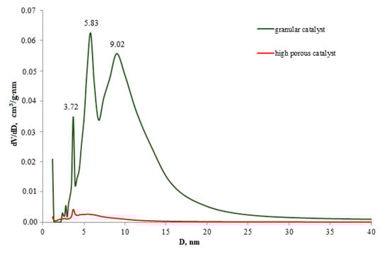 The differential pore diameter distribution curve of the highly porous catalyst with supported active components (Table 1, Figure 4) shows a low-intensity peak at 3.71 nm and wide halo without a strongly pronounced peak in the 4.45–15.5 nm range. In this case, the highly porous catalyst was characterized by a small quantity of pores in the range of <10 nm compared to the granular catalyst due to the significant contribution of the high-temperature phase α-Al2O3 of the highly porous support.