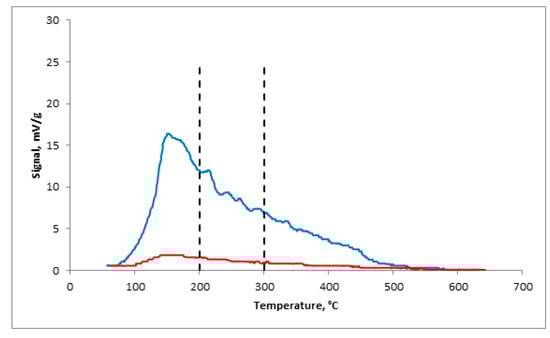 For the α-Al2O3-HPCM support, the release of the molecular probe in the full range of the study samples was not observed in the NH3–TPD spectrum. The catalyst, which was synthesized based on α-Al2O3-HPCM, characterized the low summary concentration of the Lewis and Bronsted centers. Their quantity was 30 times smaller for the (γ-Al2O3-zeolite Y)/α-Al2O3-HPCM than that of the granular catalyst, and the low percentage of strong acid centers Td ≥ 300 °C able to initiate the cracking and carbon-producing reactions was noted (Figure 5, Table 2).