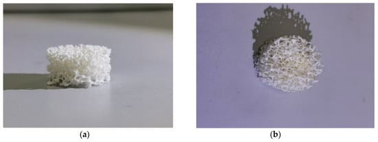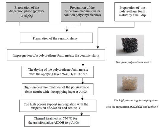The highly porous support was synthesized by template synthesis, which involves applying finely dispersed α-Al2O3 phase in aqueous media of polyvinyl alcohol on reticulated foam-celled foamed polyurethane. First, alkali dip was performed to form high surface defects on the foam polyurethane (Figure 7). Then the excess ceramic slurry was removed by pressing out the sample to the weight specified. Next the foam polyurethane matrix with the support layer of aluminum hydroxide was sequentially dried at 110 °C and subjected to annealing at 1400 °C to remove the foam polyurethane matrix and the robust α-Al2O3 scaffold formation. The catalyst was synthesized by impregnation of the highly porous support, which consisted of 15% zeolite Y and 85% pseudoboehmite. For this purpose, a suspension of boehmite and zeolite was applied on the highly porous support. The sample was dried for 1 h at room temperature and 24 h at 110 °C, with further calcination at 450 °C and 750 °C to form an additional robust scaffold and transfer from a hydroxide to an oxide.
