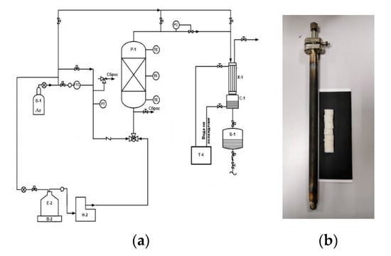Thermal and catalytic processes of decreasing oil viscosity were conducted at the facility with an isothermal flow reactor (Figure 8) at 400 °C and 1 kgp/sm2, and the delivery rate was 20 mL/h. The reactor was loaded with quartz during the tests.