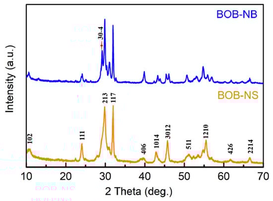 XRD patterns of Bi24O31Br10 nanobelts (BOB-NBs) and Bi24O31Br10 nanosheets (BOB-NSs).