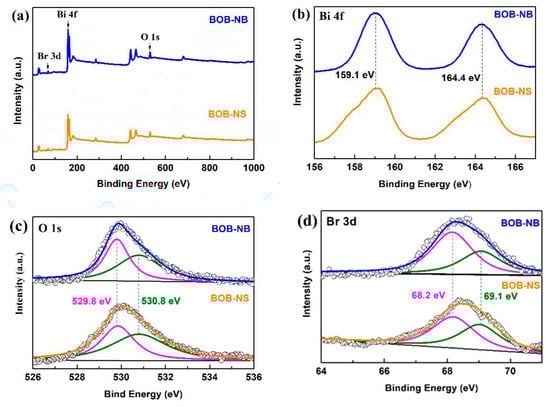 (a) Survey XPS spectrum, (b) Bi 4f, (c) O1s, and (d) Br 3d of the BOB-NBs and BOB-NSs.