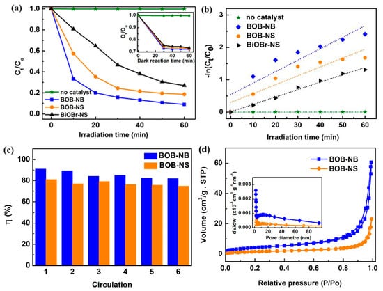 (a) Photocatalytic degradation of tetracycline hydrochloride (TTCH) with different photocatalysts (insert image shows the dark reaction), (b) corresponding kinetic equations obtained within 60 min, (c) recycling properties of the photocatalytic TTCH degradation over the BOB-NBs and BOB-NSs under the same conditions, and (d) the N2 adsorption–desorption isotherms and the pore distribution curves of the BOB-NSs and BOB-NBs.