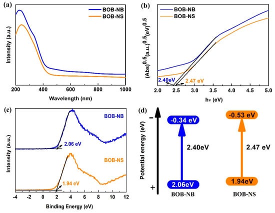 The optical properties of the as-prepared samples were examined by the ultraviolet-visible (UV-vis) diffuse reflectance spectra (DRS). From the results, the absorption edges of BOB-NBs and BOB-NSs indicate that BOB-NBs have a slightly narrower band gap (Figure 5a) []. Notably, the light absorption of BOB-NBs was slightly higher compared to that of BOB-NSs.