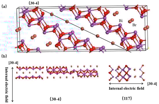 An internal electric field is caused by the polarization of the nonuniform charge distribution between different constituent layers, which is favorable for the separation and transfer of photogenerated charge carriers. This is caused by the exposed facets and material composition, which lead to different charge distributions [,]. Bi24O31Br10 is a layered structure made up of (Bi, O) and (Br) layers stacked together [], which may induce the generation of internal electric fields. However, to the best of our knowledge, the internal electric field in different Bi24O31Br10 facet exposure and its effect on their photocatalytic activity has not yet been explored.