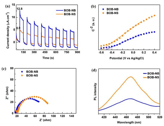(a) Photocurrent response, (b) Mott-Schottky plots, (c) electrochemical impedance spectroscopy (EIS) Nyquist plots, and (d) photoluminescence (PL) spectra of BOB-NSs and BOB-NBs.