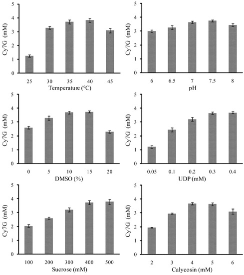 A considerable number of UGTs involved in the glucosylation of flavonoids have been isolated and functionally characterized from plants [21]. These UGTs typically tolerate a broad range of aglycones with high regiospecifity in vitro [22,23]. In the present study, the regioselective and effective glucosylation of calycosin was achieved using UGT88E18 isolated from Glycine max. In addition, a UGT88E18–SuSy cascade reaction was developed to synthesize Cy7G using cheap sucrose as the expedient glucosyl donor.