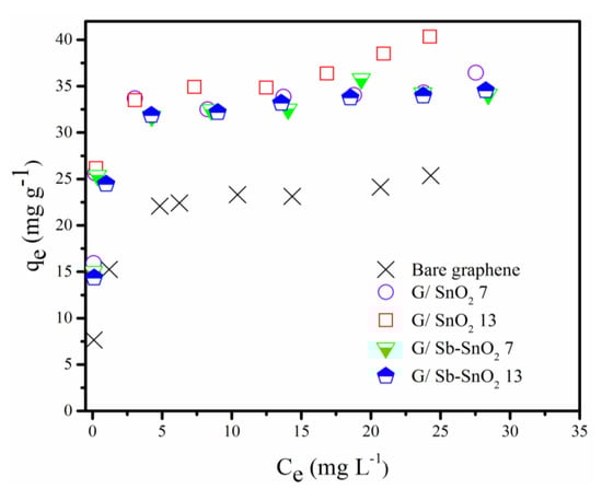 Adsorption isotherm studies were carried out to find the adsorptive capacity of the prepared samples and to determine the adsorption range to be used for adsorbent regeneration studies. The results obtained are depicted in Figure 4. Table 1 shows the calculated surface area for each sample using the BET method. It can be seen that G/SnO2 and G/Sb-SnO2 have higher adsorptive capacities than the bare graphene. As the surface area of the graphene and composite materials are all similar, we can conclude that the surface area is not responsible for higher uptake capacity of the composite adsorbents. The difference in the adsorptive capacity can be either due to contribution of the metal oxide in adsorption or the better dispersion of the nanocomposite in the water (i.e., agglomeration of the bare graphene particles may lead to a loss of adsorptive capacity).
