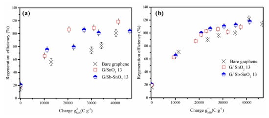 Effect of charge passed on regeneration efficiency of MB adsorption on bare graphene, G/SnO2 13, and G/Sb-SnO2 13. (a) NaCl electrolyte and (b) Na2SO4 electrolyte (current density of 10 mA cm−2).
